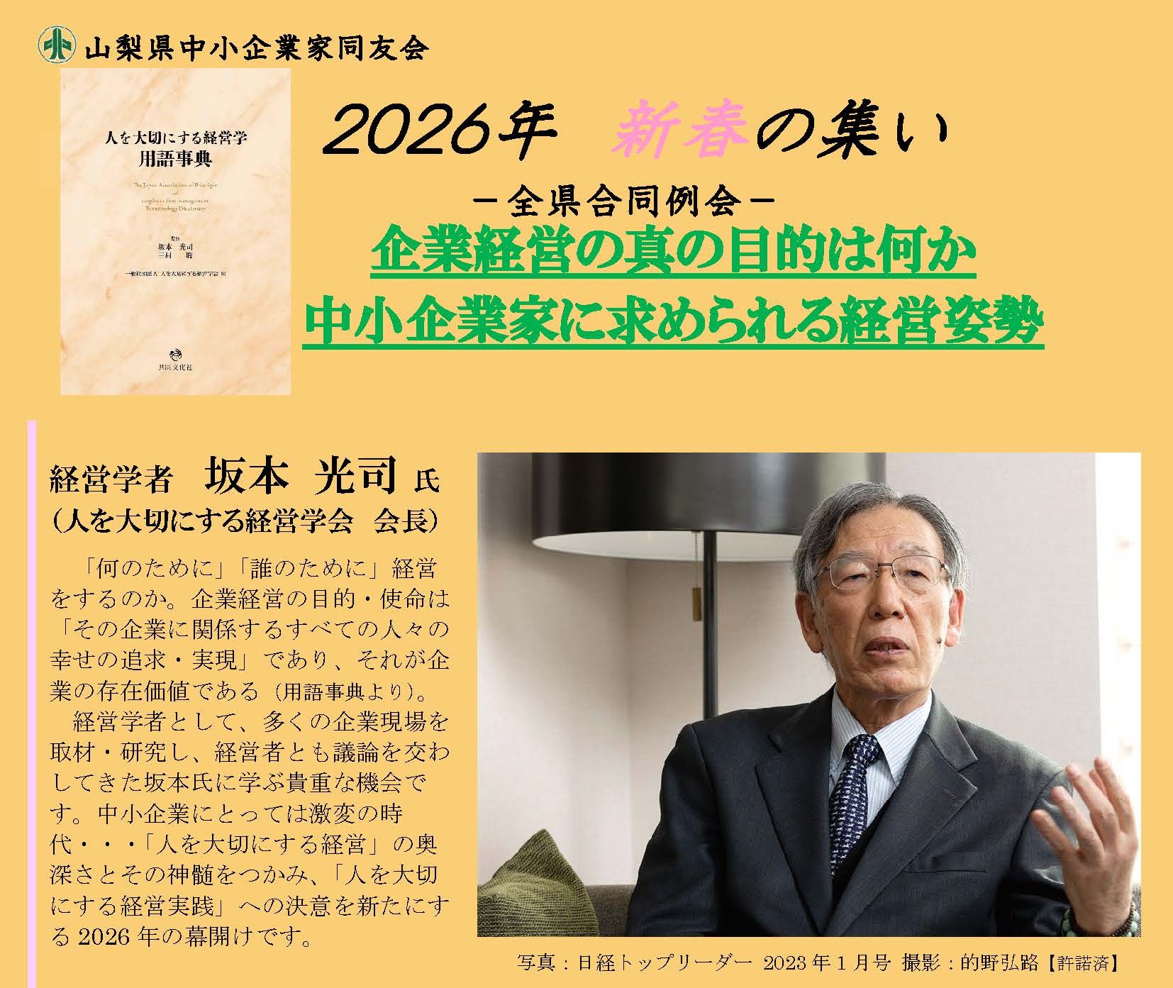 経営学者として、多くの企業現場を取材・研究し、経営者とも議論を交わしてきた坂本氏に学ぶ貴重な機会です。中小企業にとっては激変の時代・・・「人を大切にする経営」の奥深さとその神髄をつかみ、「人を大切にする経営実践」への決意を新たにする2026 年の幕開けです。